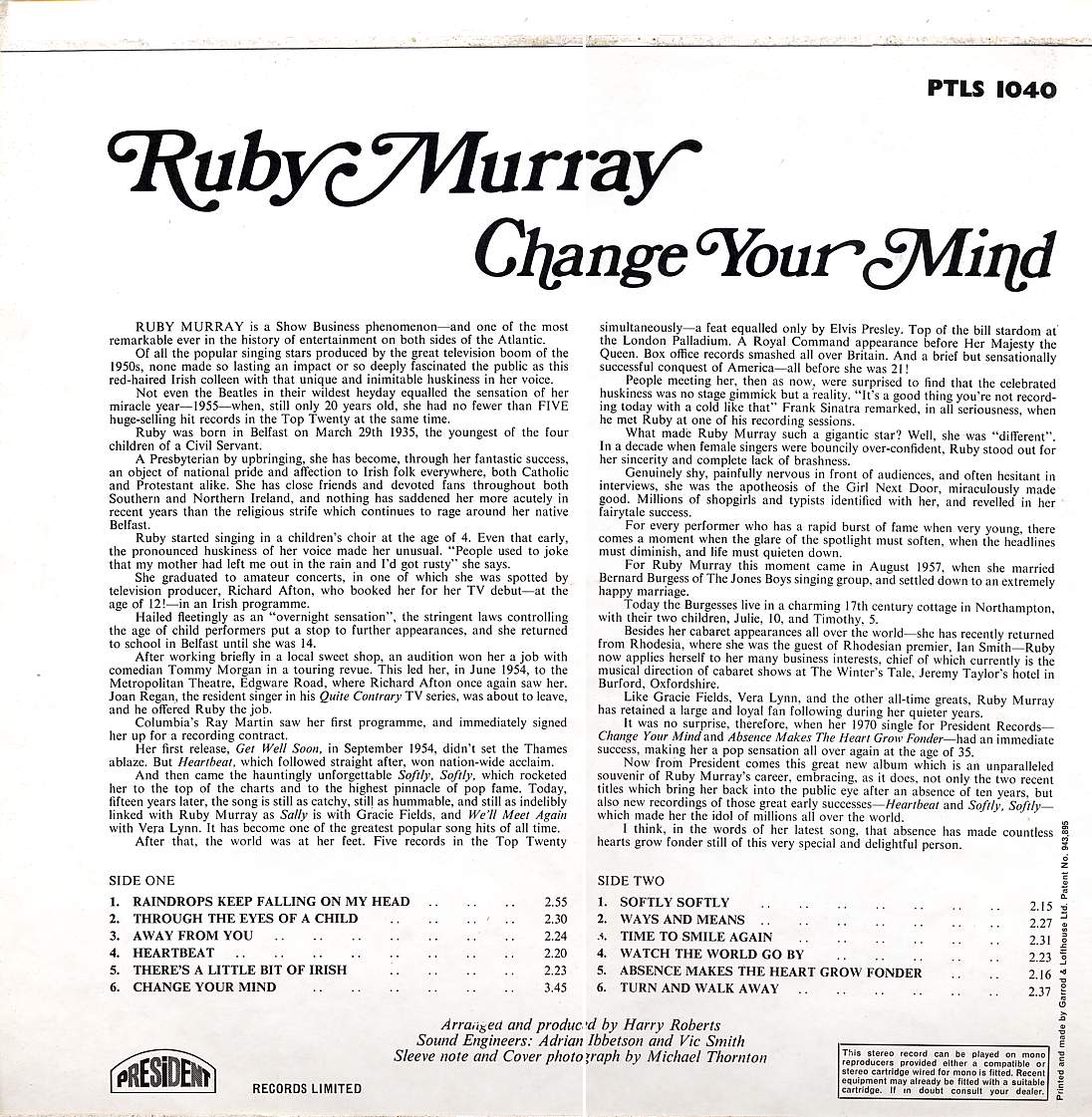 Song Listing for "Change Your Mind" LP. The cover picture is already in the library.