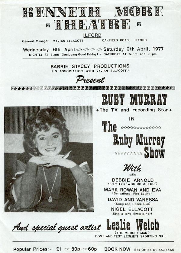 | Description | The Ruby Murray Show - Poster, Kenneth More Theatre, Ilford - April 1977 (Sorry that my previous upload incorrectly states 'Poster' - Those two photographs [including one with me!] were taken after one of the Kenneth More Theatre shows in April) |