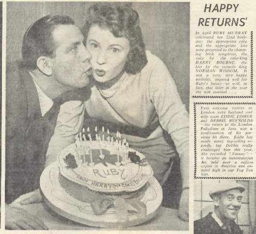 Ruby's 22nd birthday - the cake and a kiss from Norman Wisdom (Record Mirror annual, Jan.1958)