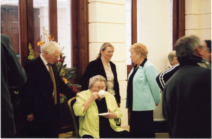 Marie Cunningham has "a wee cup of tay", with daughter Sarah (behind Marie) and son-in-law Joe looking on
