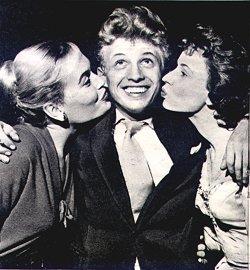 Tommy Steele gets kisses from Ruby & Shirley Eaton